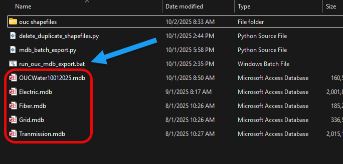 After downloading the OUC GIS files from the FTP, download the attached "OUC Conversion.zip", and unzip it. Take all of the .mdb files from the OUC and place them at the root of the OUC Conversion folder, and then double click "run_ouc_mdb_export.bat" file, as shown in the screenshot below. The listed files in the redbox are the only ones we are concerned with.
