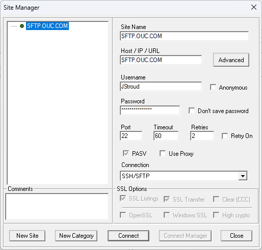 OUC updates are provided via an FTP connection. Using an FTP client (CoreFTP is preferred by OUC), below is an example of the connection profile. Reach out to 'Manderson, Teresa L.' <TManderson@ouc.com> with any FTP connection issues.